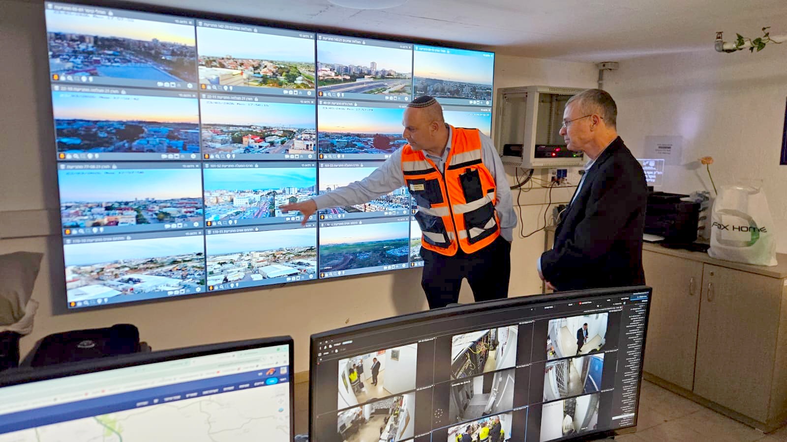 השר לוין מקבל סקירה על המוקד הרואה של עיריית לוד שמפעיל 1500 מצלמות. צילום: עיריית לוד
