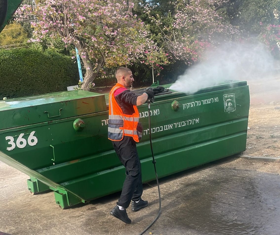 כל כלי אצירה עובר ניקוי וחיטוי לאחר איסוף האשפה בלוד. צילום: עיריית לוד